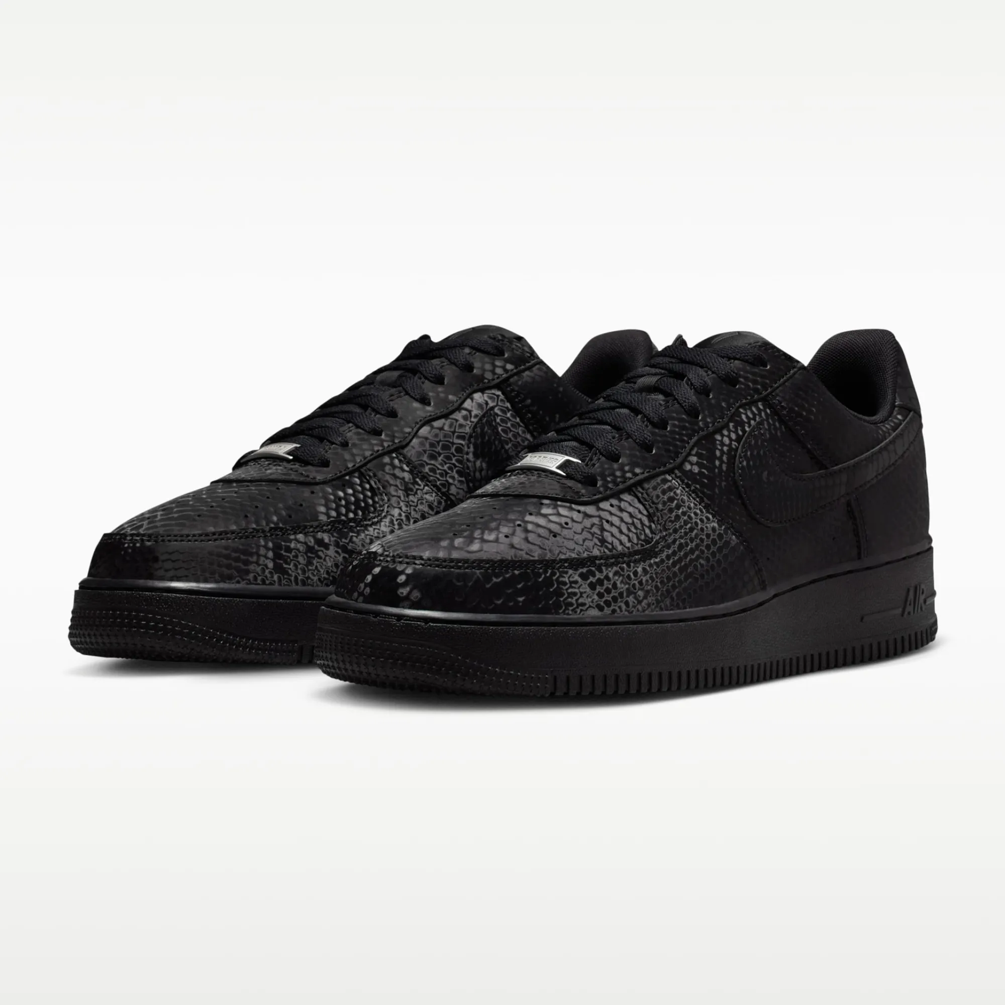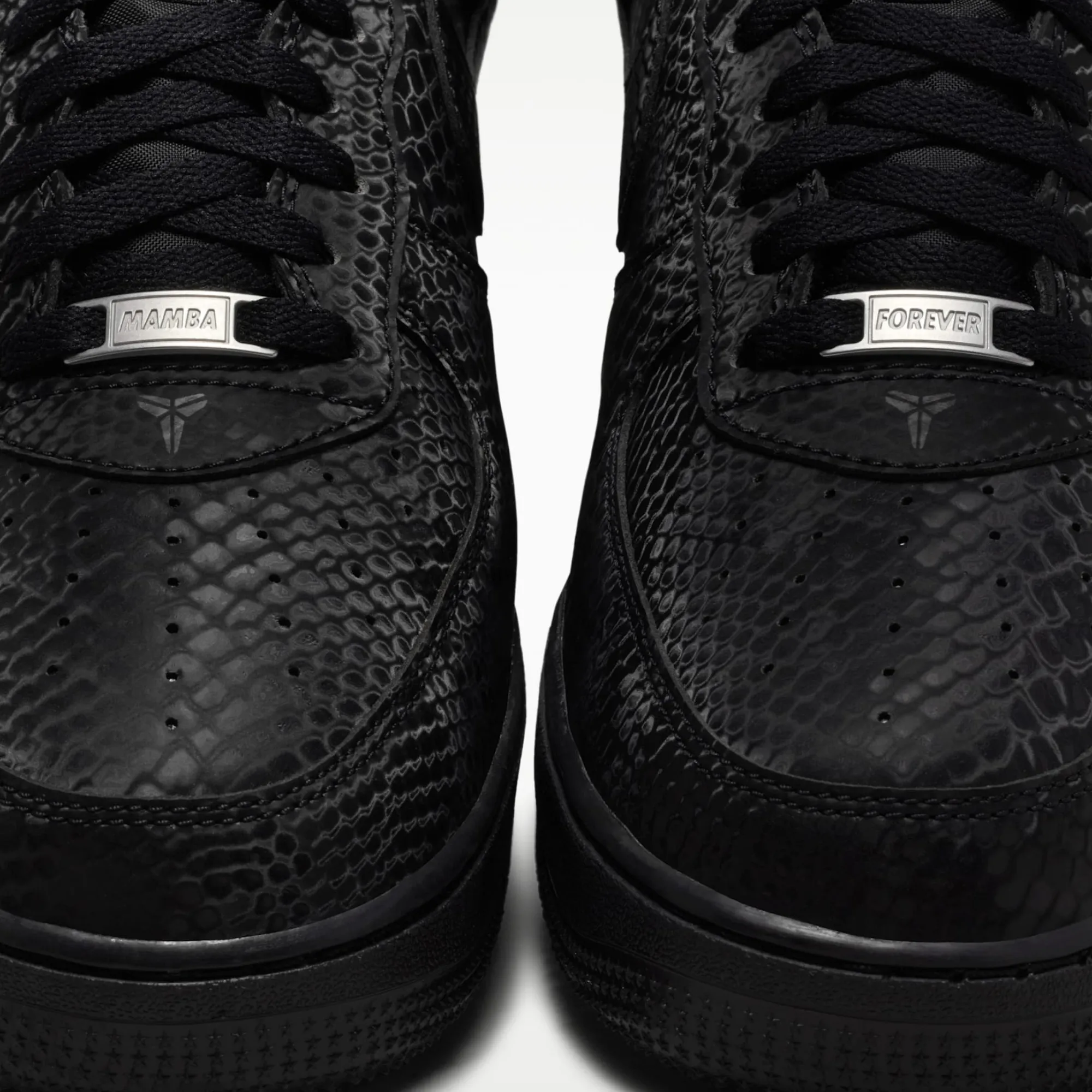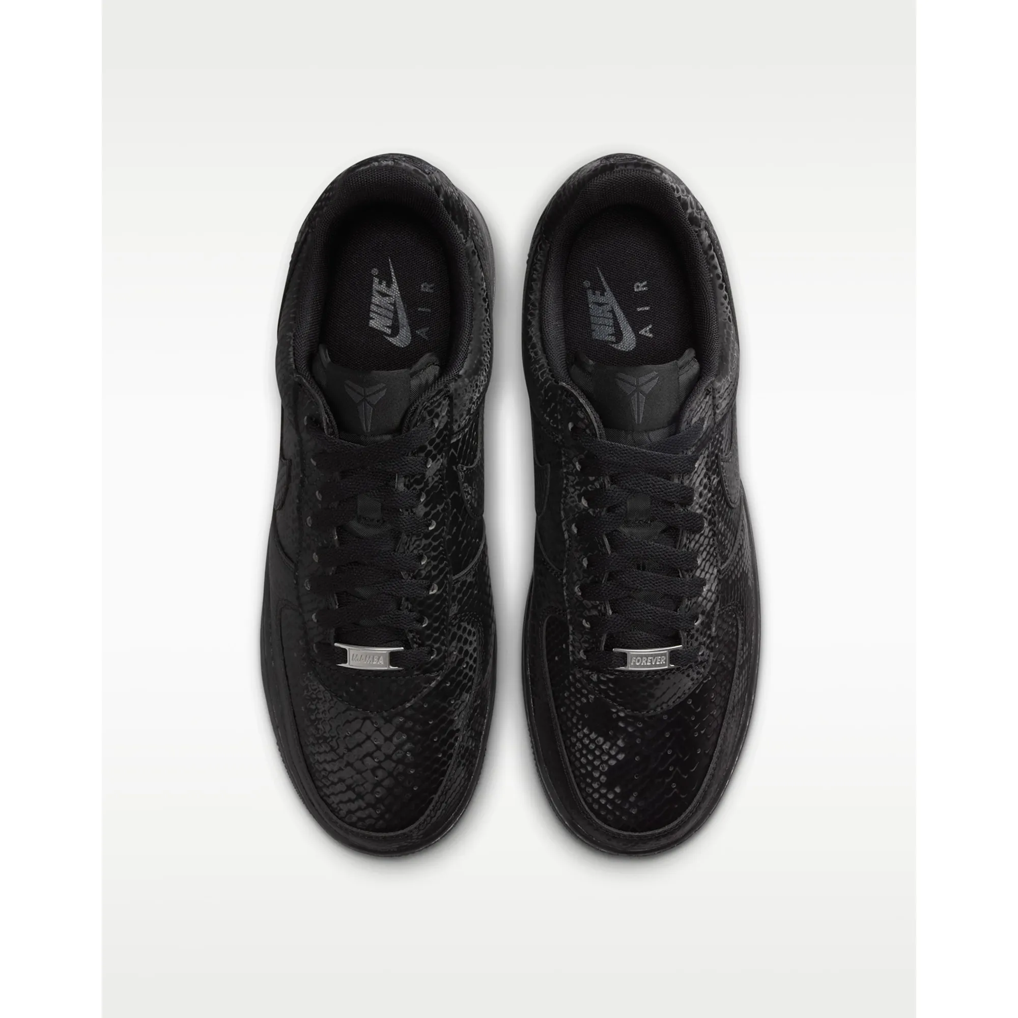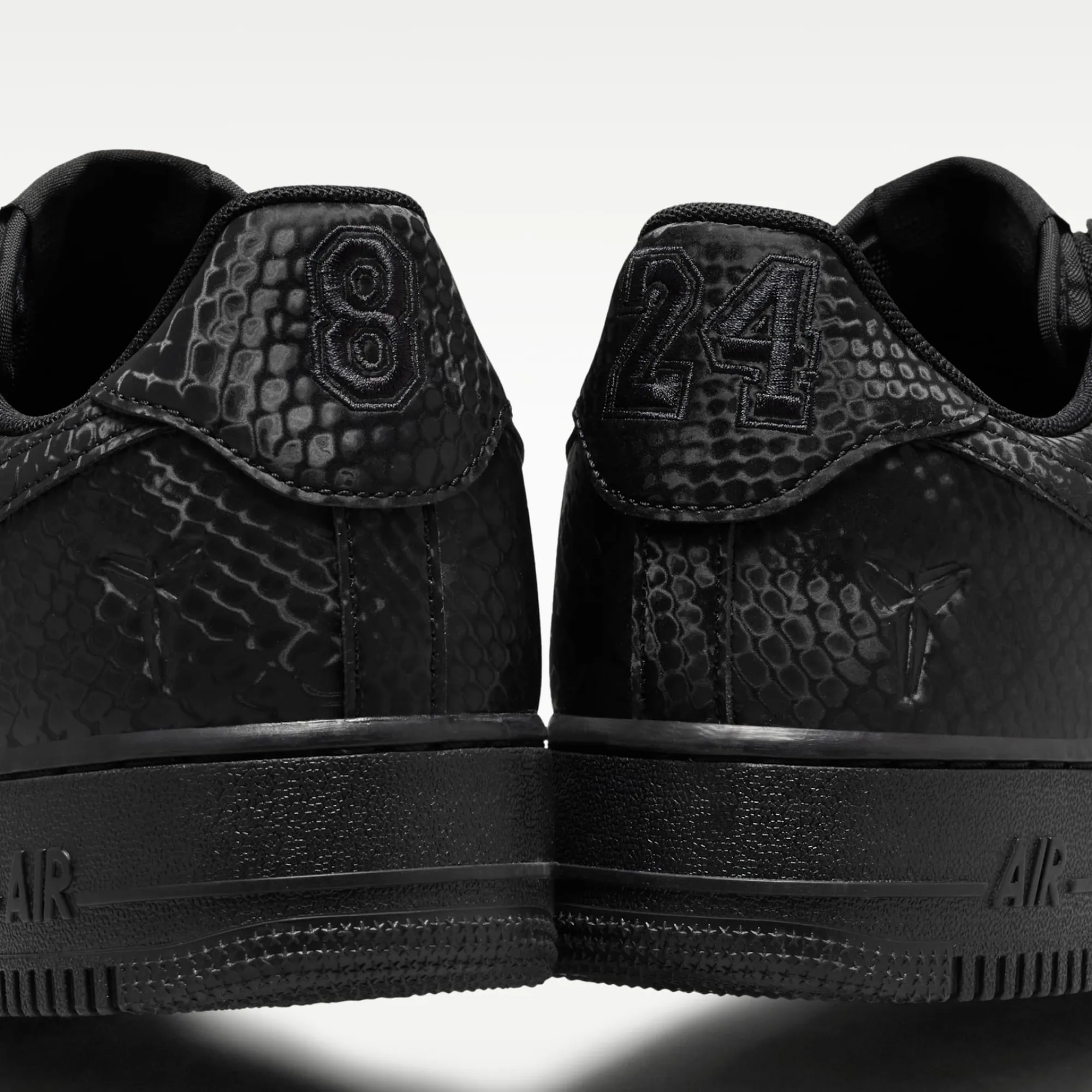 The Air Force 1 is already a legend. But the KOBE BRYANT AIR FORCE 1 takes that legend and gives it a special edge. From the image, you can see the standout detail immediately: a black-on-black upper with a snakeskin-style texture across the panels. That textured look is what separates this pair from regular black AF1s. It’s subtle, but it’s serious. Under light, it has that “rich shine” effect that makes people lean closer to confirm what they’re seeing.