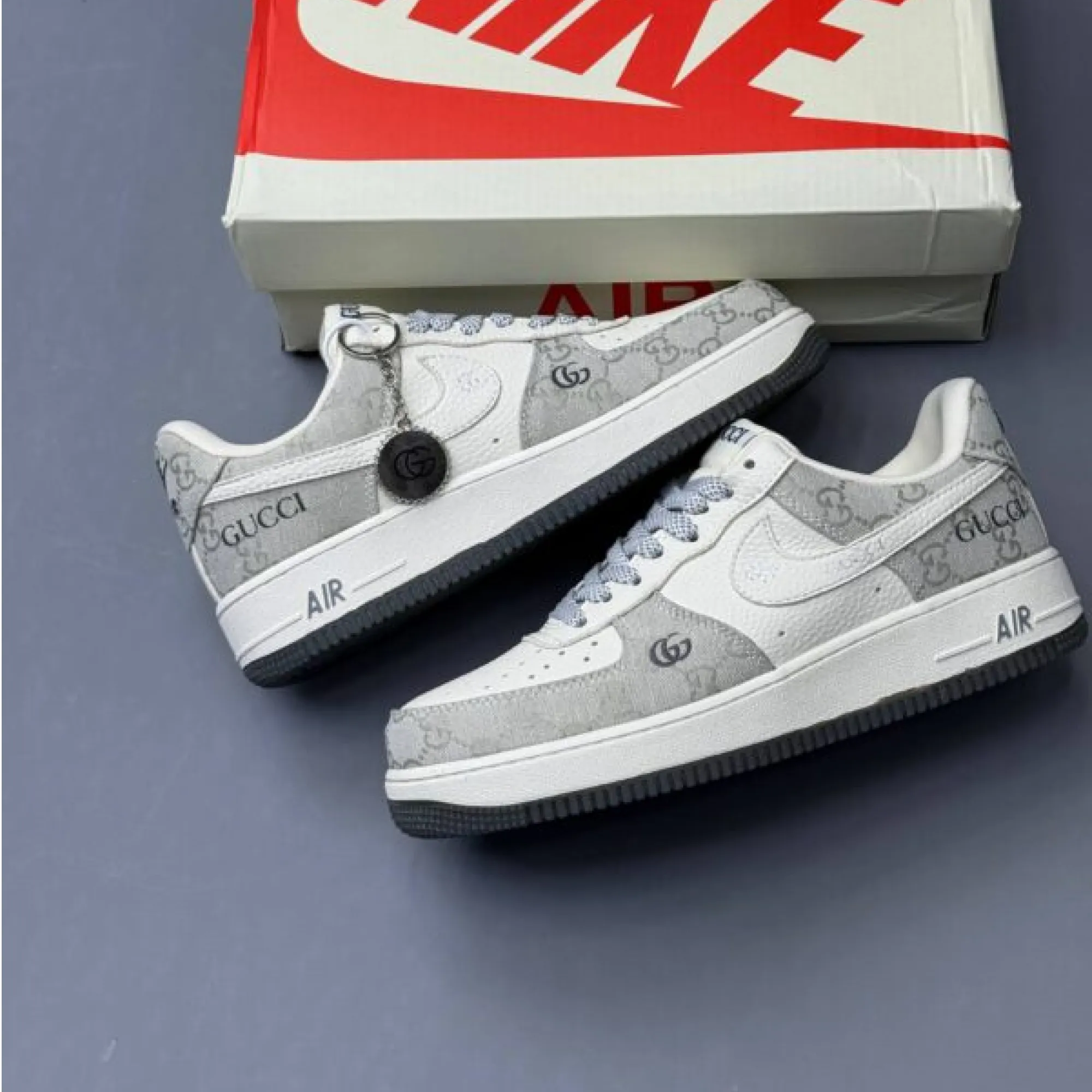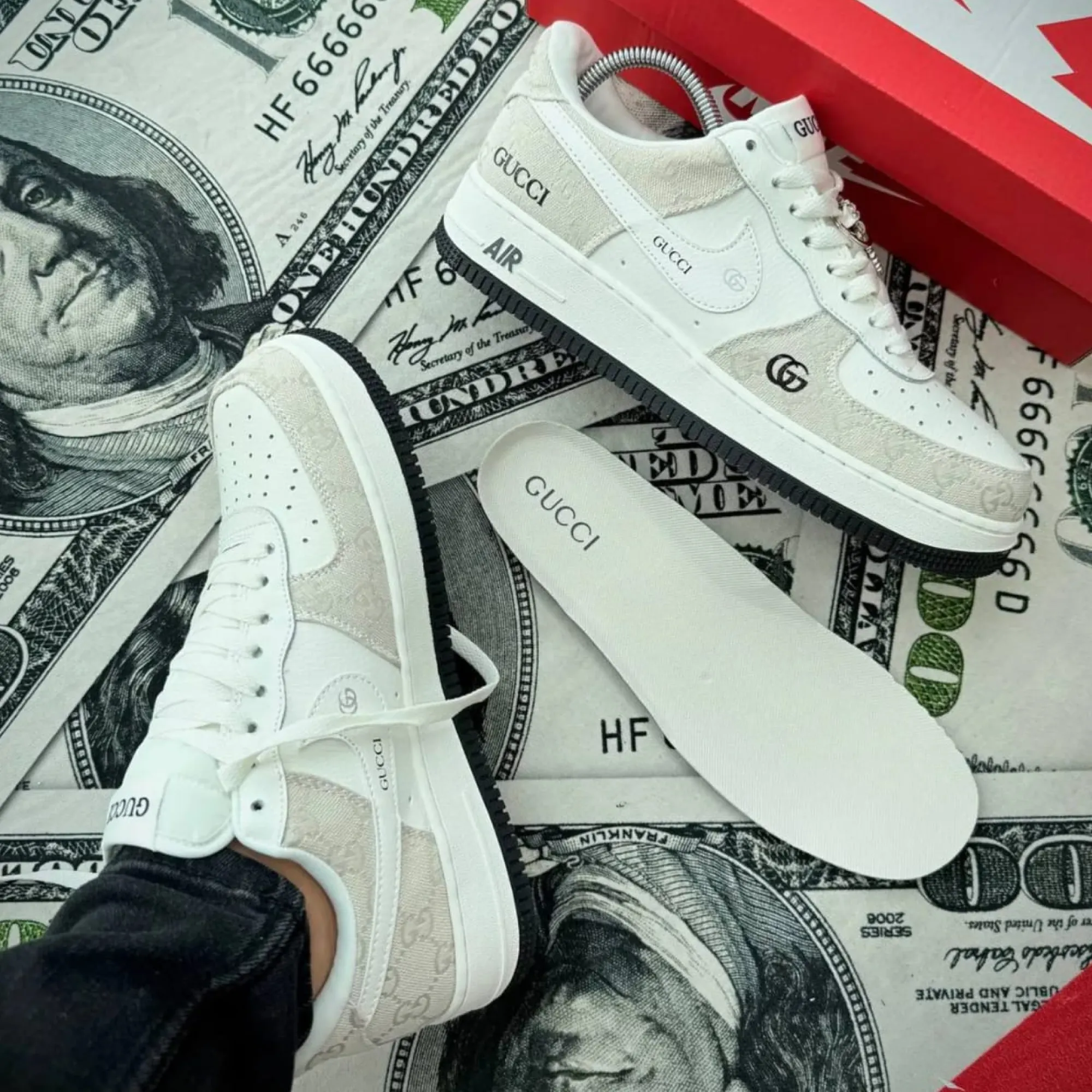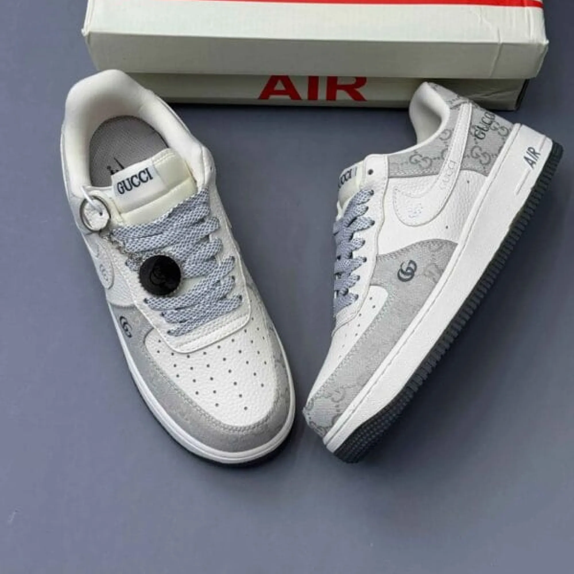 The Nike Air Force 1 ESQUISITE Gucci blends the timeless Nike Air Force 1 silhouette with a luxury-inspired Gucci aesthetic that feels rare, elevated, and seriously fresh. One look at this pair and you’ll see why sneaker lovers are obsessed. The upper comes in a smooth, clean cream-white tone that makes styling easy, while the designer-inspired monogram-style fabric panels add that classy, premium touch. The embroidered Gucci branding details, sleek Swoosh placement, and black accents create a rich contrast that instantly upgrades your outfit. This is the kind of pair that makes even a simple jeans-and-tee combo look intentional, expensive, and fashion-forward.