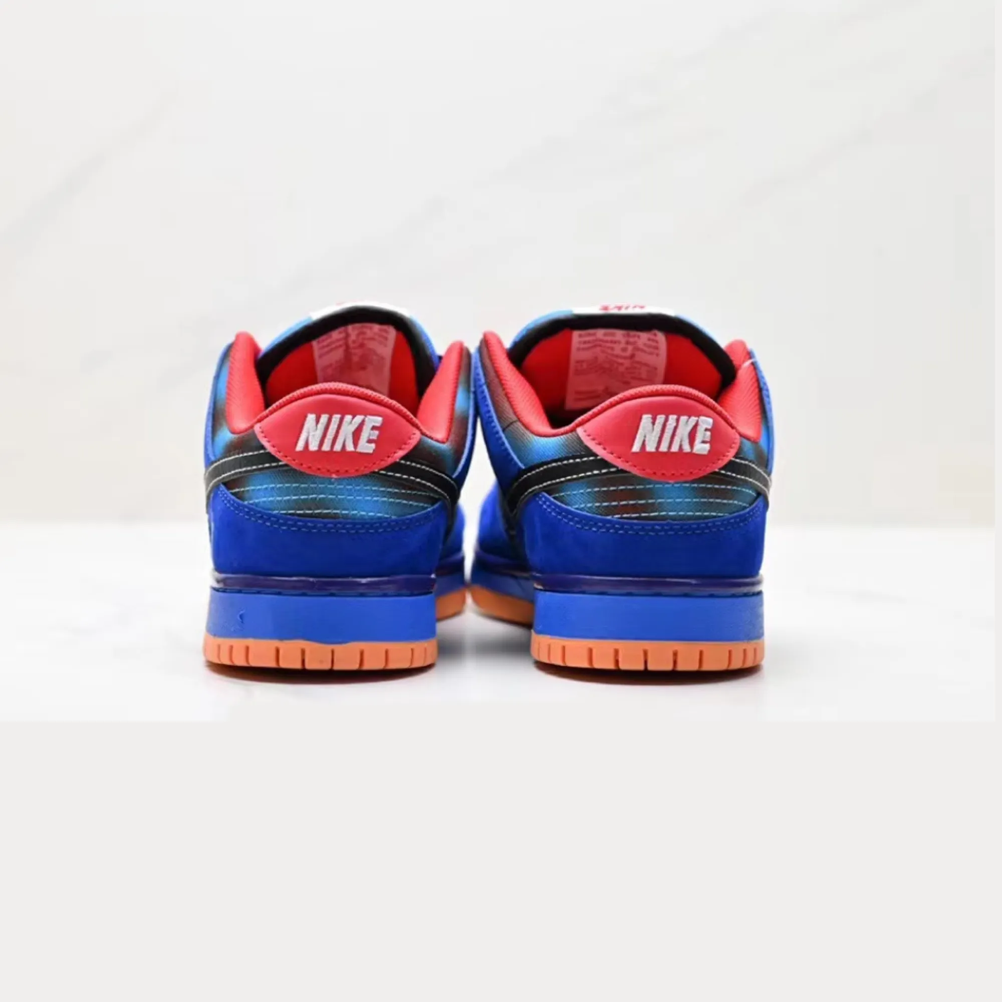 From the image, the Spiderman x Nike Dunk Low SB is dripping in deep royal blue with a black Swoosh outlined by clean contrast stitching. Then you get that superhero punch: a bright orange outsole that pops like comic-book action. The inner lining has a red hit, giving that classic Spidey colour combo without making the shoe look childish.